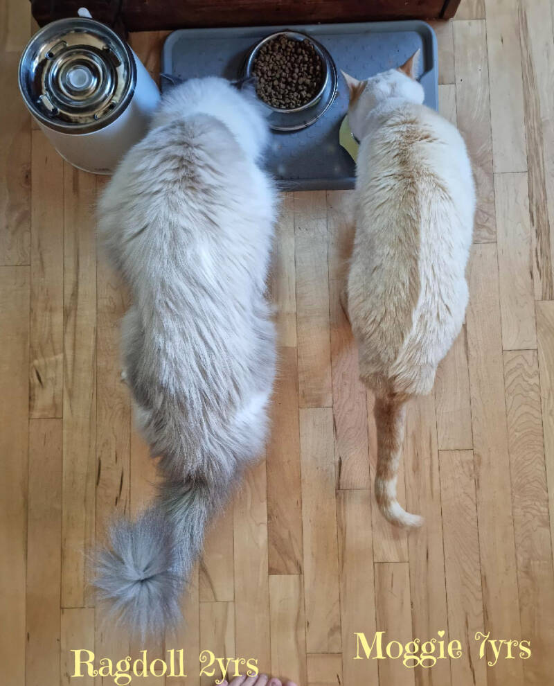 An example of a 2yr old Ragdoll with a 7 yr old cat to show the size. We are asked a lot if Ragdolls get along with dogs.