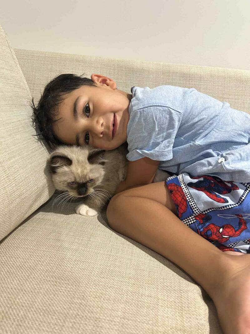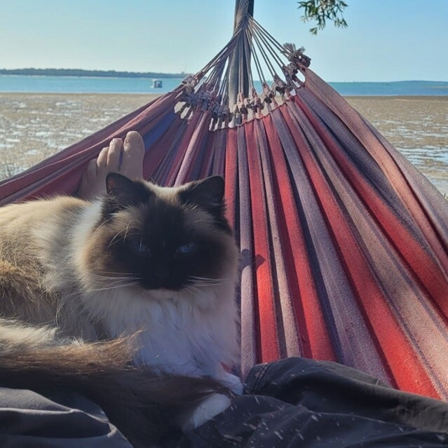 "Miss Luna at the beach with Brett. Janine's two boys Oliver & Hunter Kyle & Jades kittens Arty & Mochi